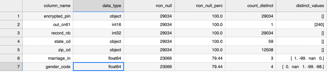 1. CSV Files: For the 1% datasets, available CSV files provide a swift method to determine the availability of data pertaining to specific features of interest. Corresponding to each .dta file, there are associated CSV files that encompass details like column names, data types, counts of non-null values, percentages of non-null values, counts of distinct values, and lists of distinct values (applicable when the count is less than 10). Additionally, a consolidated Excel file for the entire dataset has been generated for user convenience. You can navigate through individual Excel files based on your desired year or opt for the comprehensive Excel file covering the entire dataset.