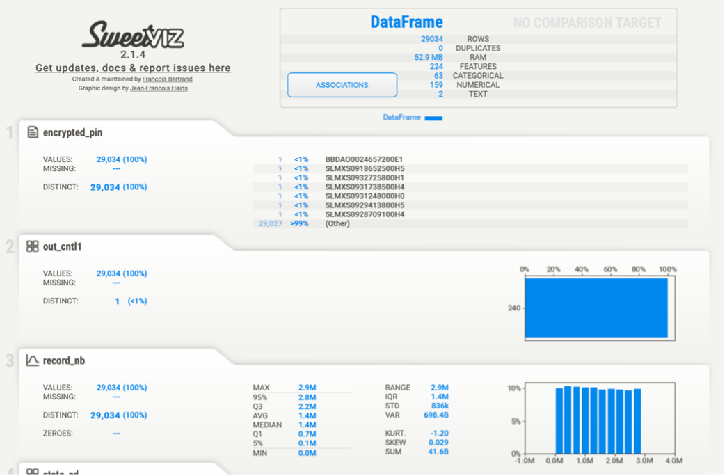1. HTML Files : HTML files created using the SweetViz library are valuable for comprehending the distribution of specific features, the structure of the data frame (size of the dataset), and the breakdown of features into categories, numerical values, and text. This is also beneficial for gaining insights into descriptive statistics.