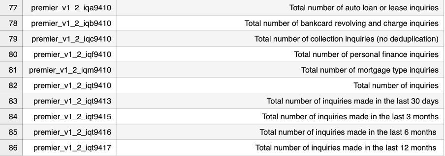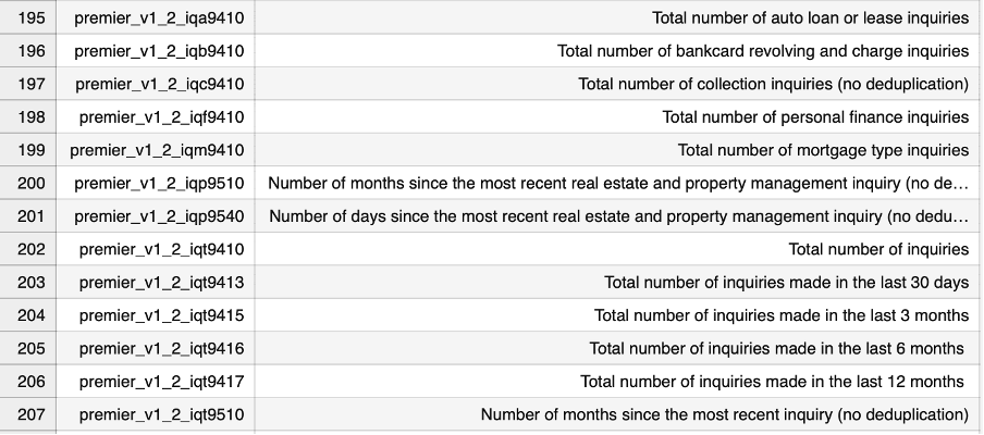 Step 2: For instance, let's assume we're intrigued by the inquiries data and wish to understand how they evolve over time and across their subtypes. To achieve this, navigate to the 'Premier_Glossary.csv' document. This resource provides an extensive list of Premier attributes within the dataset, accompanied by their corresponding definitions.